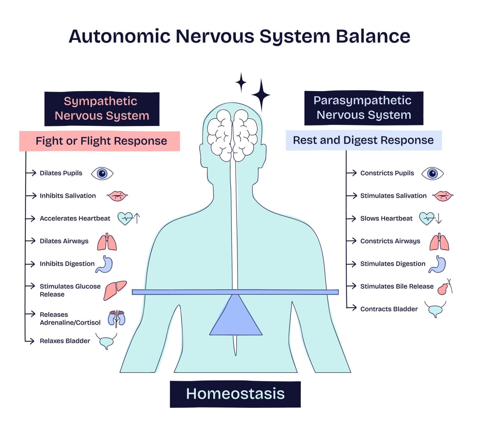 The sympathetic and parasympathetic systems work like a finely tuned see-saw, constantly adjusting to keep the body in homeostasis—a stable internal balance. They rarely operate in isolation.